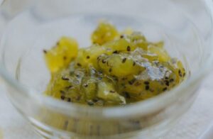 作り方:キウイを小さくカットし、砂糖とレモン汁を加えて弱火で煮詰める